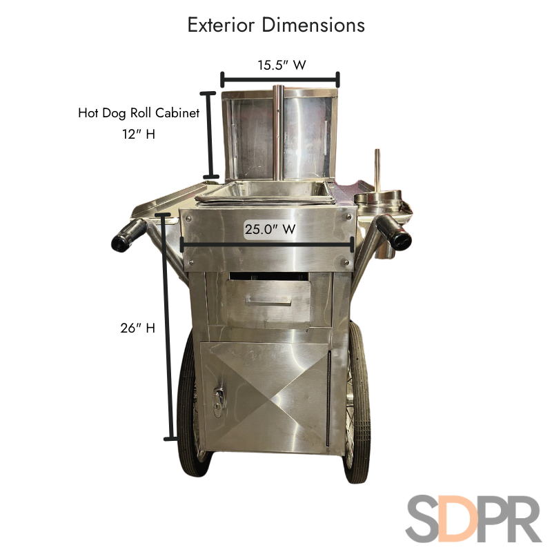 Hot Dog Cart (Sterno Included) 47.5"H x 35.5"L (45" Long to tip of Handle) 25"W x 66"H to top of umbrella 74" Diameter of Umbrella